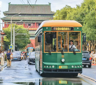 北京市“年夜美中軸線機場接送推薦不雅光巴士”路過鼓樓。北京市文明和游玩局供圖