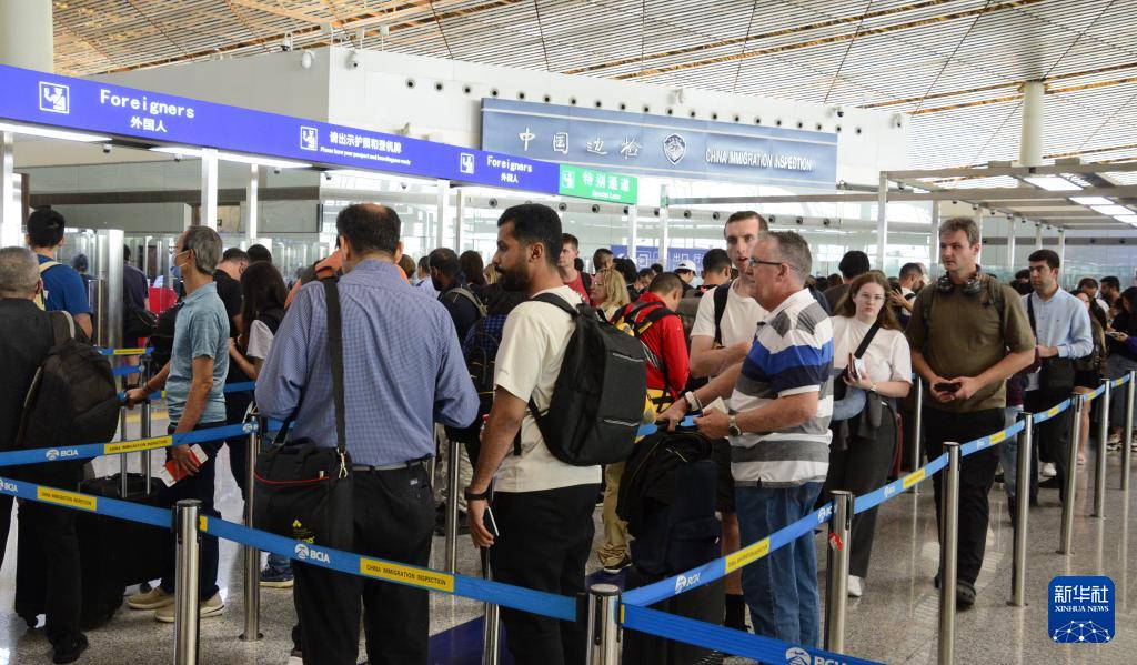 7月10日,國外搭客從北京首都機場邊防檢查站進台灣大車隊機場接送境。