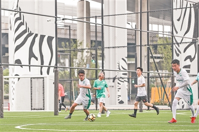 上海市姑蘇河中環立交橋下,市平易近在踢足球。 新平易近晚報記者 李銘珅攝