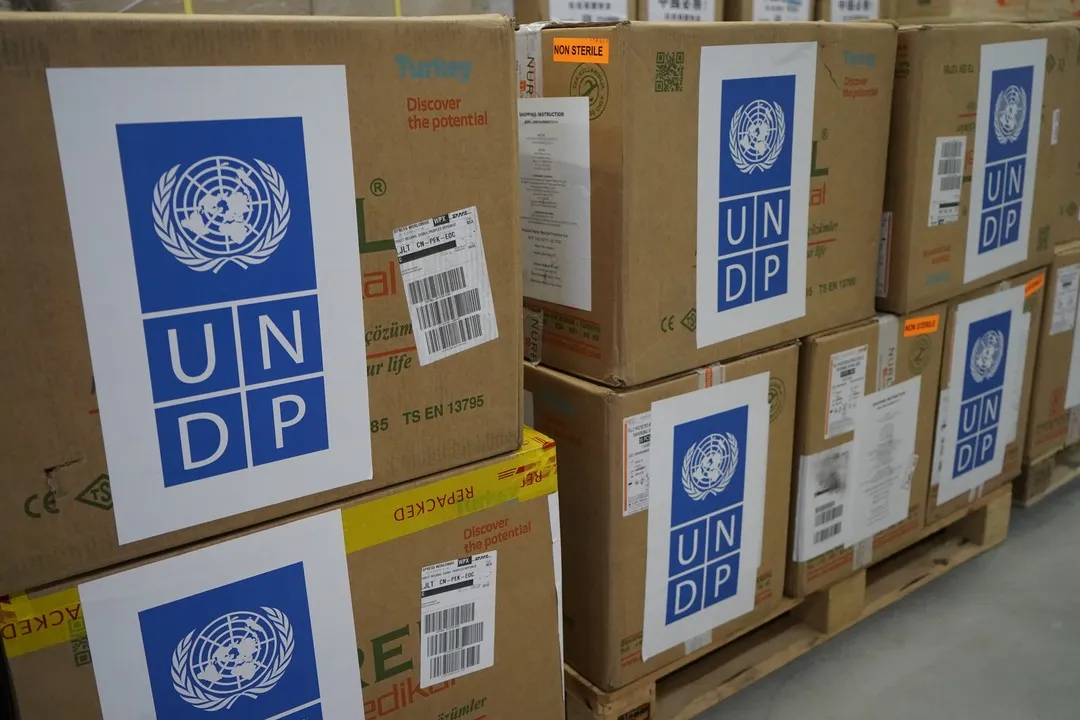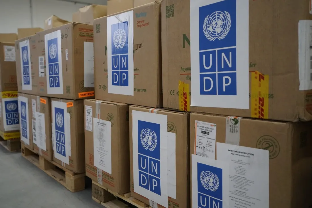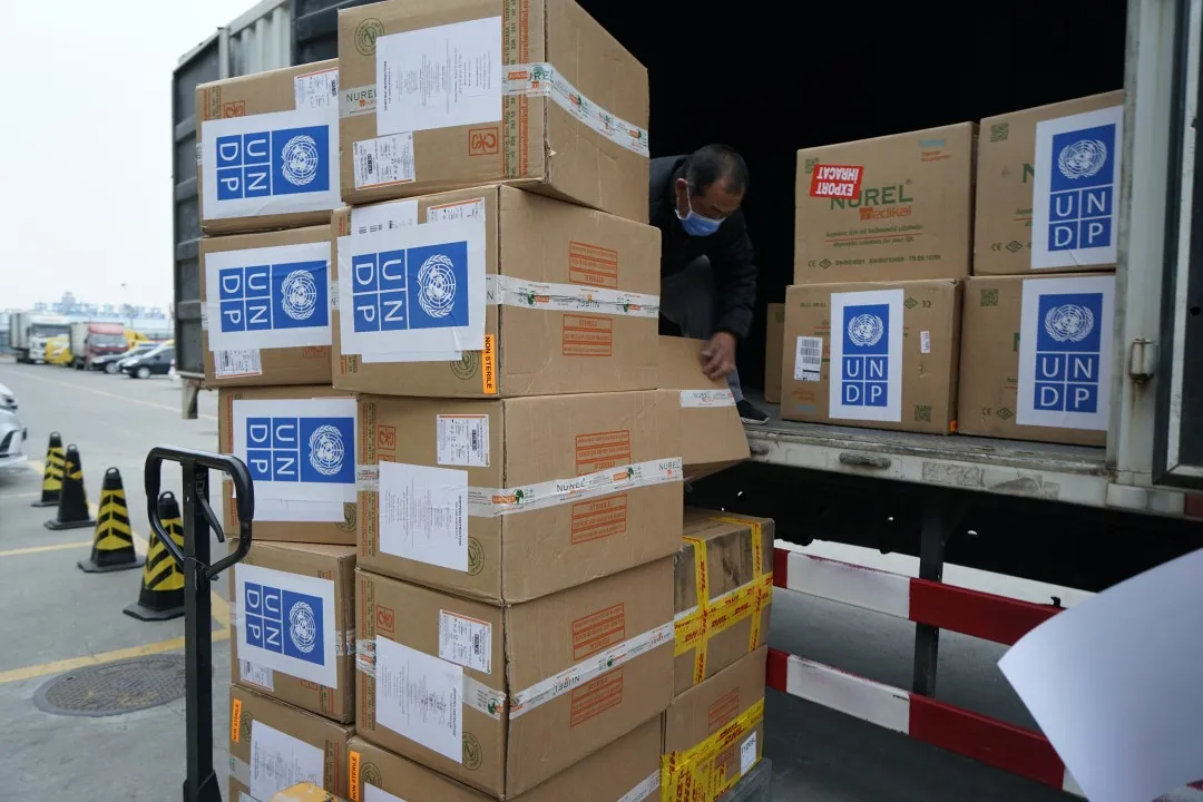 這是聯合國開發計劃署為應對飯店機場接送新型冠狀病毒疫情從土耳其采購的一萬套防護服中的第一批。第二批物資計劃28日發出。