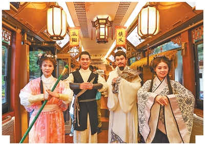 10月5日,湖北襄陽,“黃蓉”“郭靖”“諸葛亮”“黃月英”(從左向右)在“俠義襄陽”游台北到桃園機場接送玩公交上與游客互動。